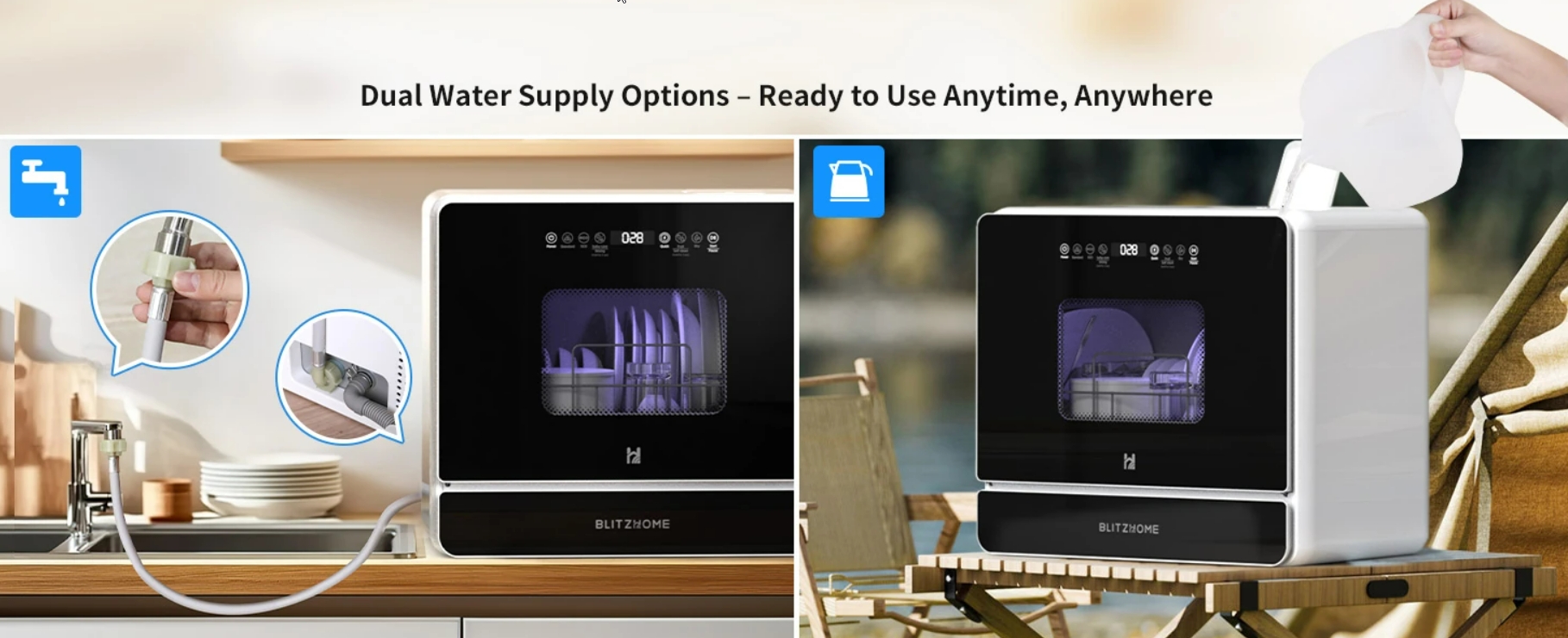 A BLITZHOME BH-6-CDW egyik legnagyobb előnye a beépített, 5,2 literes víztartály. Ez a megoldás lehetővé teszi, hogy ott is használható legyen, ahol nincs kiépített vízcsatlakozás – csak töltsd fel a tartályt, és már indulhat is a mosogatás (de ráköthető vezetékes vízre is)!