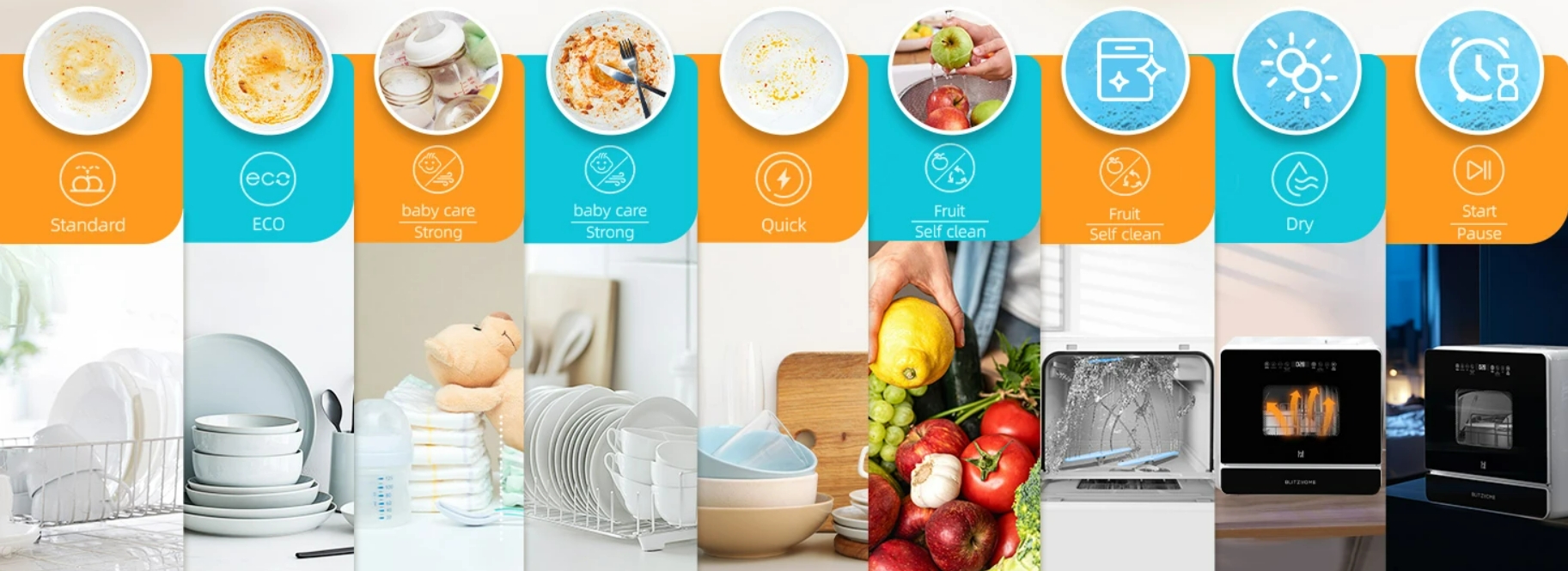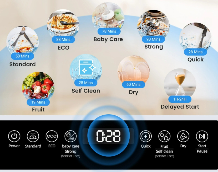 Kilenc különböző mosogatási program közül választhatsz, köztük ECO, intenzív, gyors, babaápolás és gyümölcsmosás üzemmód is helyet kapott.