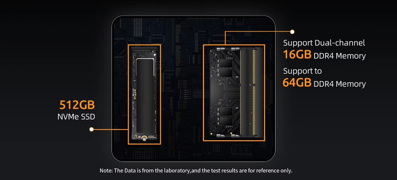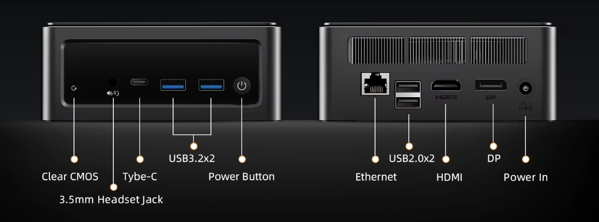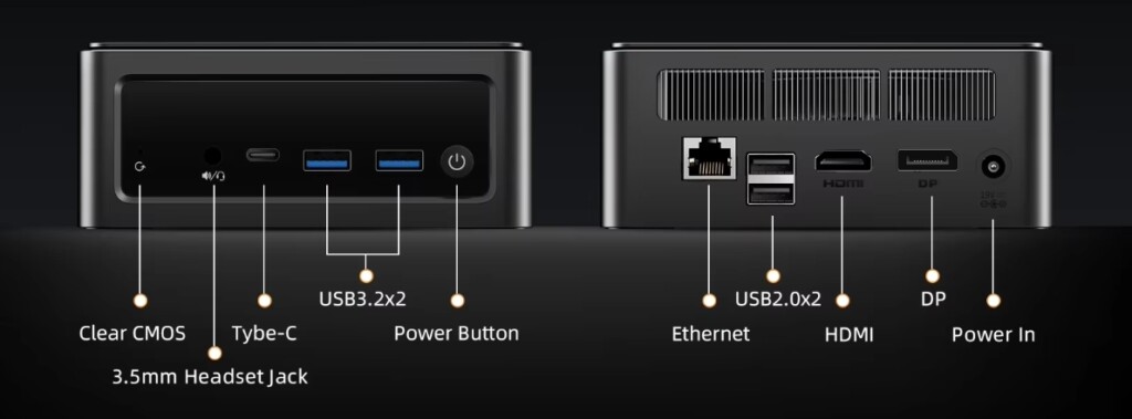 A BMAX B5A Pro csatlakozási lehetőségei egész jók egy ilyen kompakt géptől. Találunk rajta egy 3.5 mm-es kombinált jack csatlakozót fejhallgatóhoz vagy mikrofonos headsethez, egy HDMI 2.1 kimenetet, valamint egy DisplayPort 1.4 csatlakozót is, így akár két külső monitort is gond nélkül kezel.