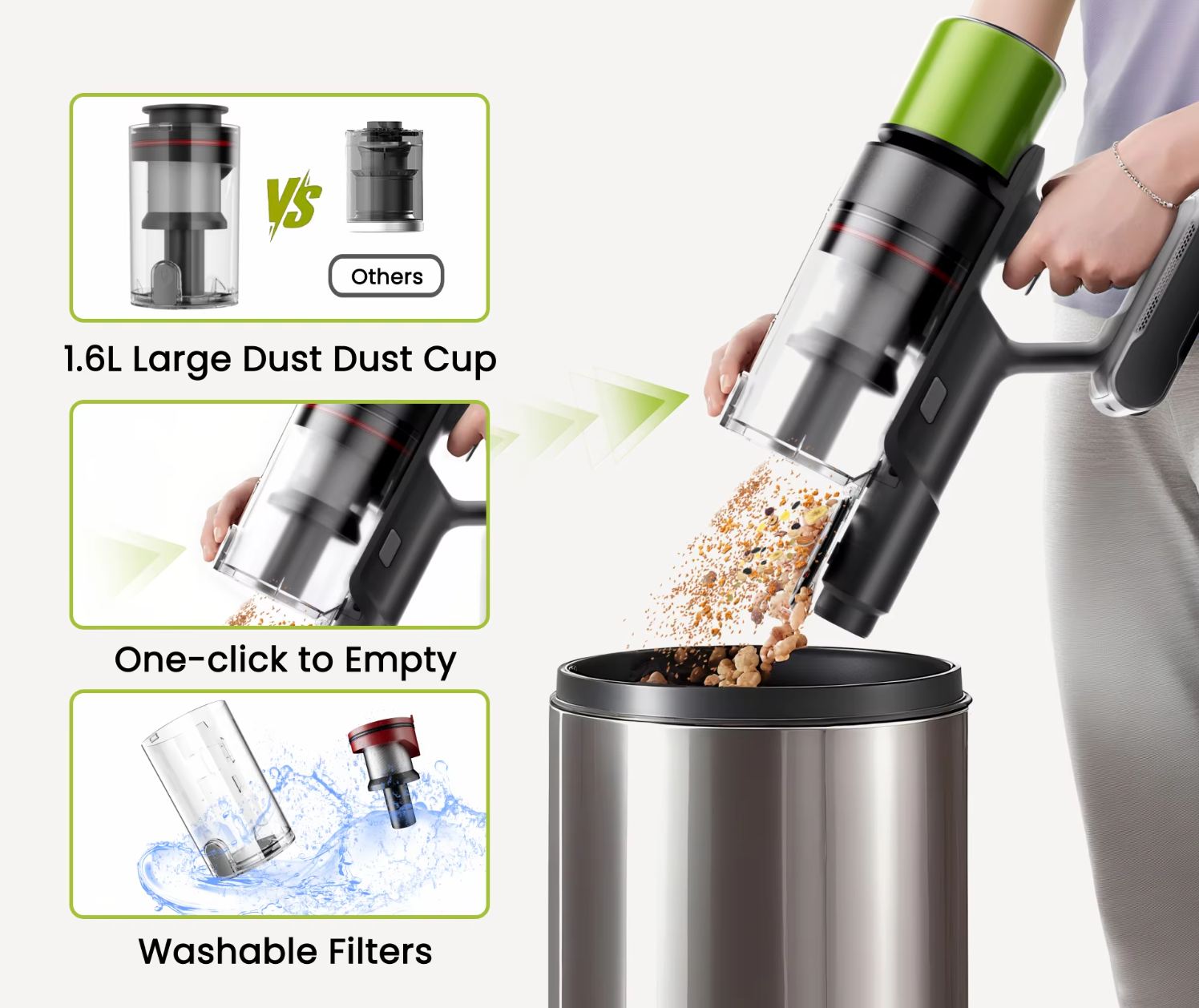 Többszörös szűrést végez és HEPA szűrő gondoskodik arról, hogy a levegőbe ne kerüljön vissza semmi, amit felszív.