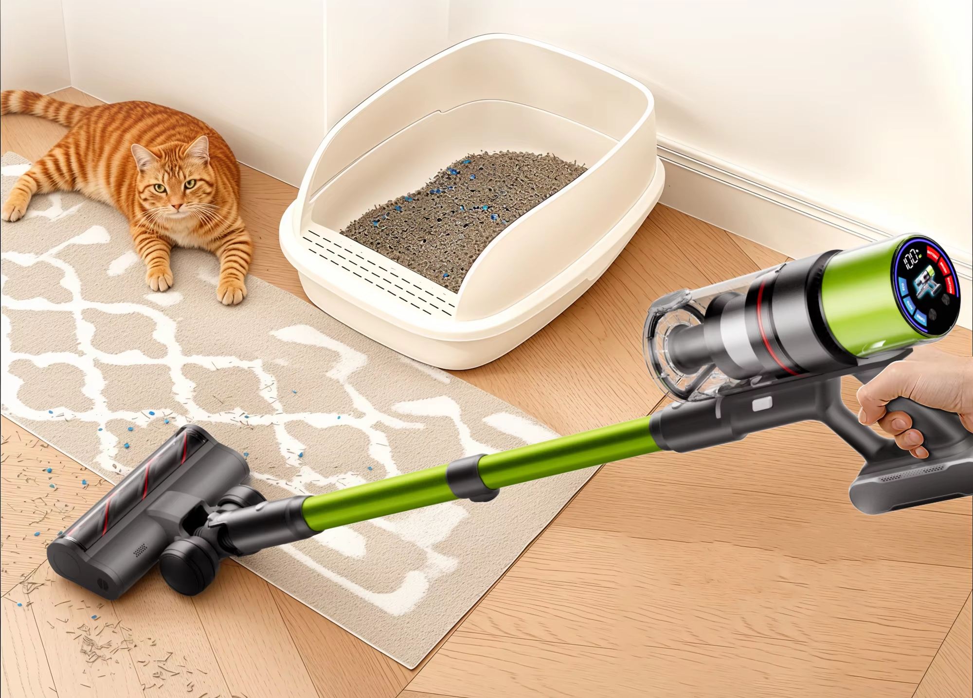 A fő porszívófej saját motorral rendelkezik, amely egy kefés hengerrel segíti a takarítást és tökéletes padlóra, szőnyegre is.