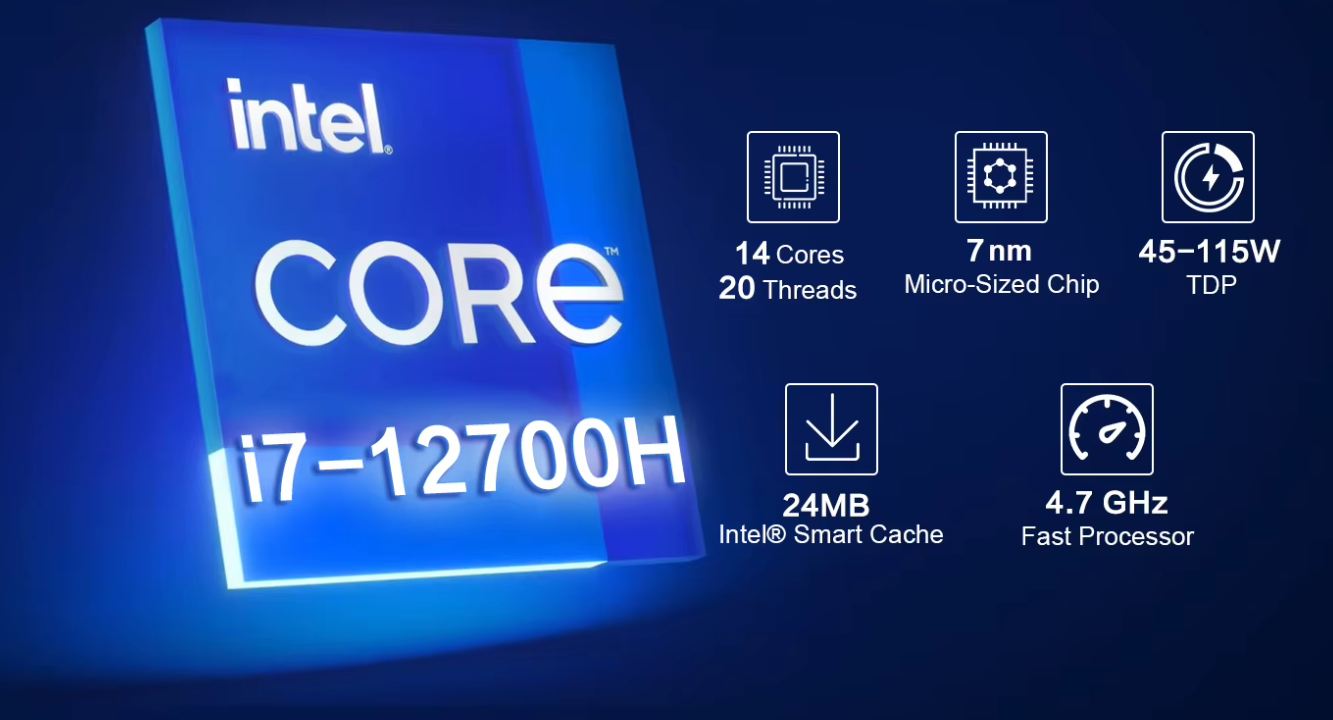 Az árkategóriában extrém erős, de egyébként is erős a felsőkategóriás Intel Core i7-12700H mini PC / laptop processzorral 14 maggal, 20 szállal. 4.70 GHz-ig tud felmenni, ami biztosítja a gyors reakcióidőt és kapunk még 16GB RAM-ot, 1TB-os SSD meghajtót.