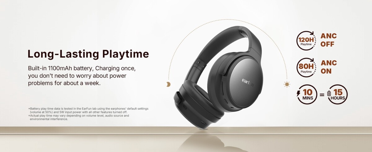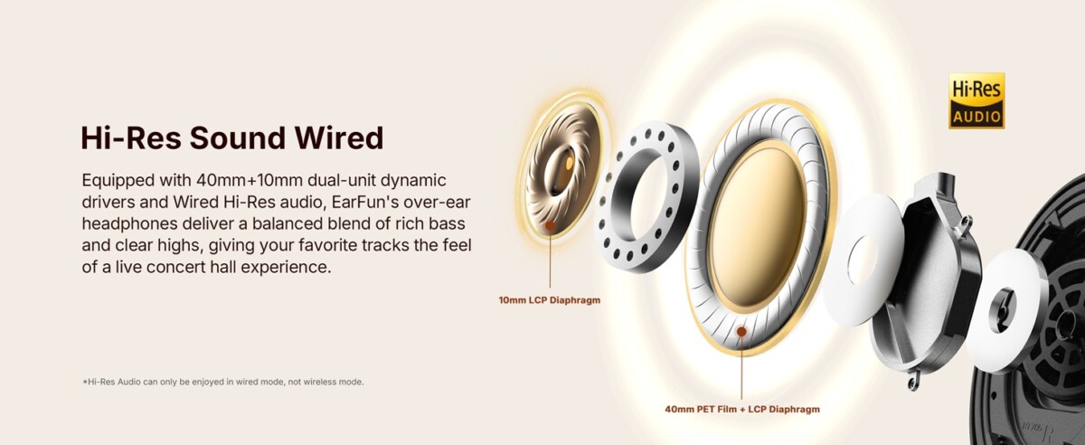 “A fejhallgató 40 mm + 10 mm-es dupla dinamikus meghajtóegységekkel és vezetékes Hi-Res hangzással van felszerelve. Az EarFun fülre illeszkedő fejhallgatója gazdag basszusokat és tiszta magas hangokat ötvöz kiegyensúlyozott módon, így kedvenc zenéid úgy szólnak, mintha egy élő koncertteremben hallgatnád őket.”