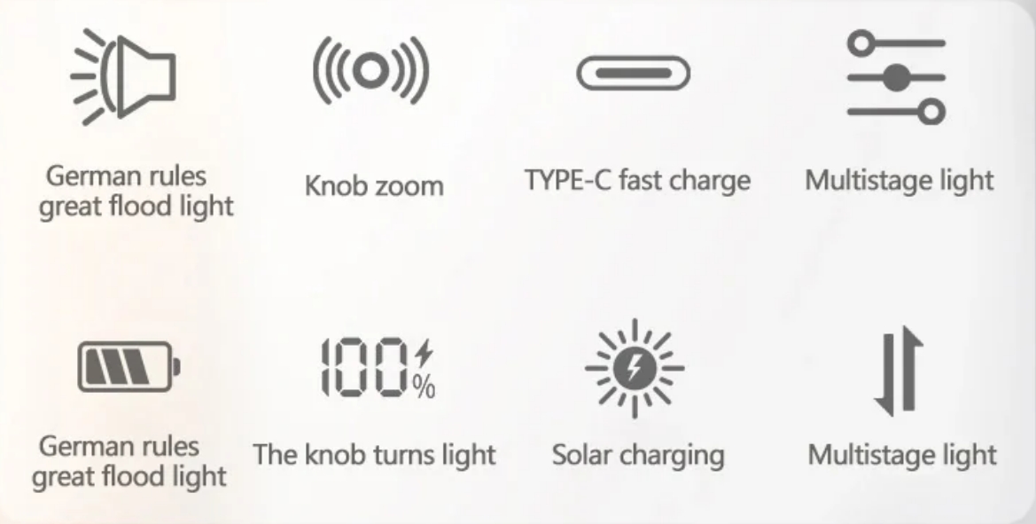 - Fény módok: Fehér fény (erős, gyenge, SOS), piros fény (folyamatos, SOS), a fehér fény fókusza forgatható