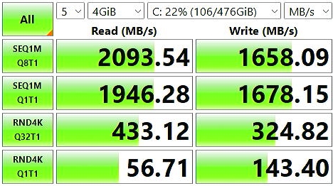 A gyári meghajtó sebessége nagyon jó, amely maximum 2100 MByte / mp szekvenciális olvasási és 1650 MByte / mp írási sebességet jelent.