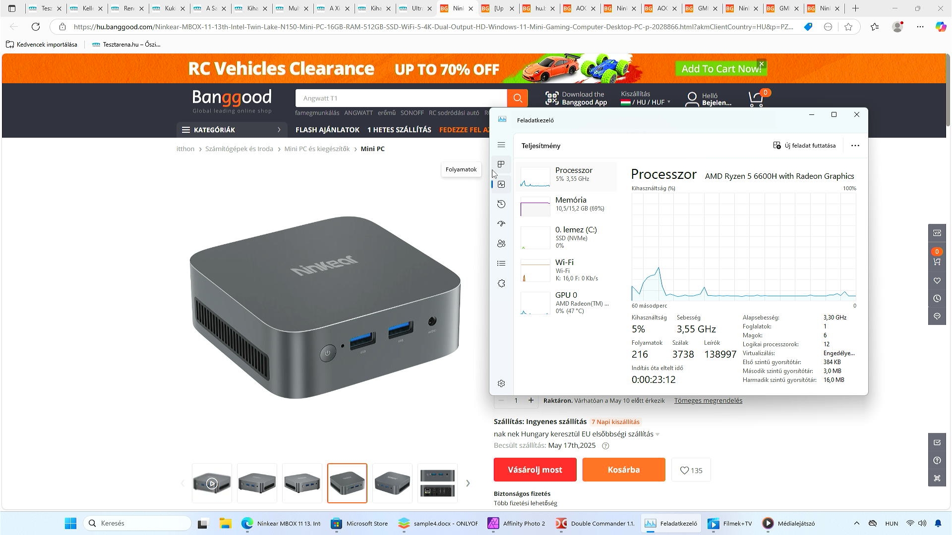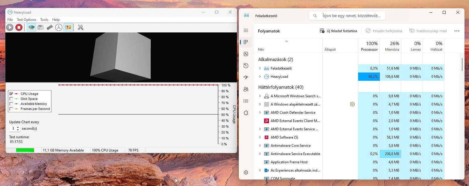 Ebben a példában böngésző elindítva 20 lappal, szövegszerkesztő, táblázatkezelő nagyobb fájlokkal és képszerkesztő is fut pár egyéb program mellett.