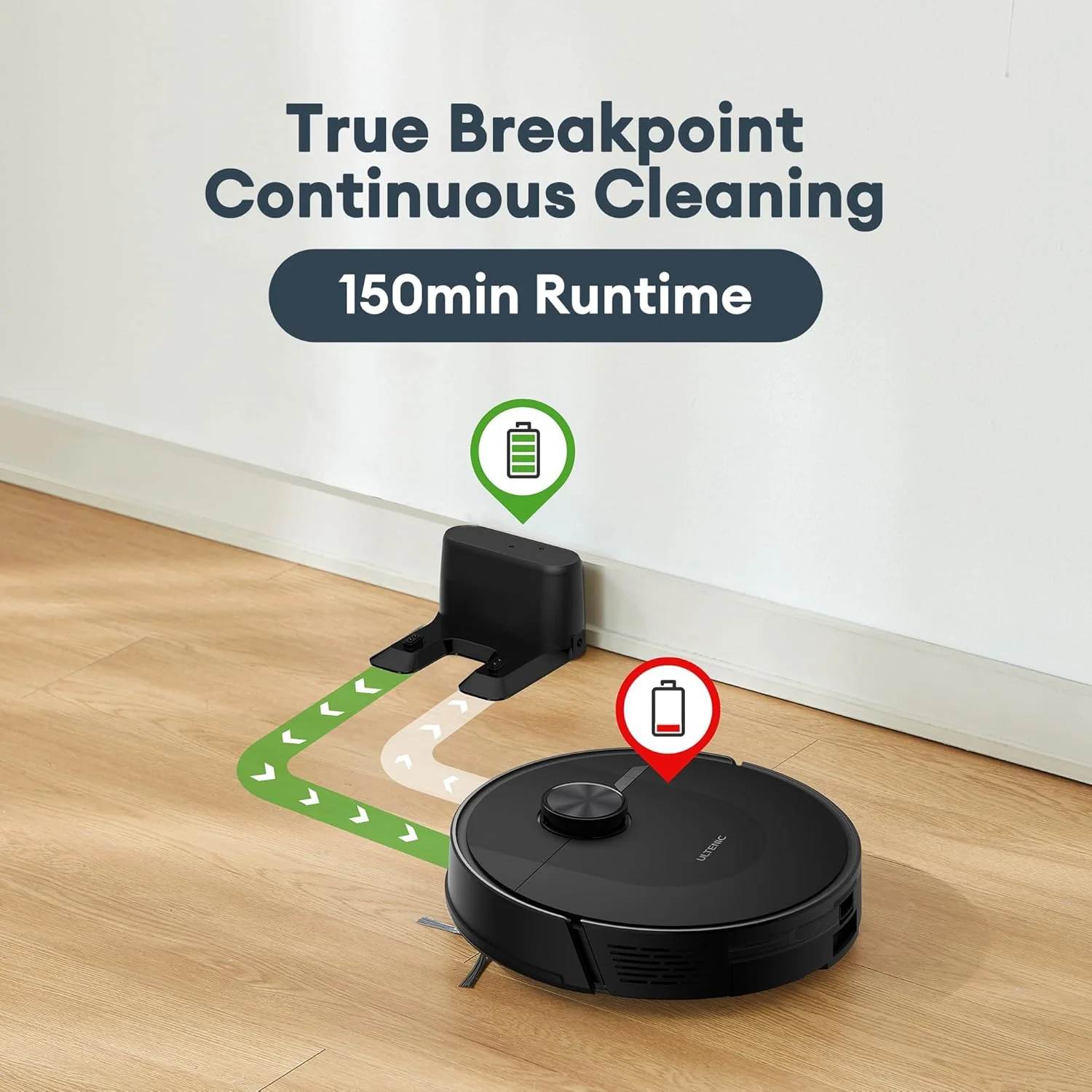 Egyetlen töltéssel akár 150 percig is működik, ami elegendő egy nagyobb lakás vagy ház kitakarításához. Ha lemerül az akkumulátor, automatikusan visszatér a töltőállomásra, és 85 százalékos töltöttség után onnan folytatja, ahol abbahagyta.