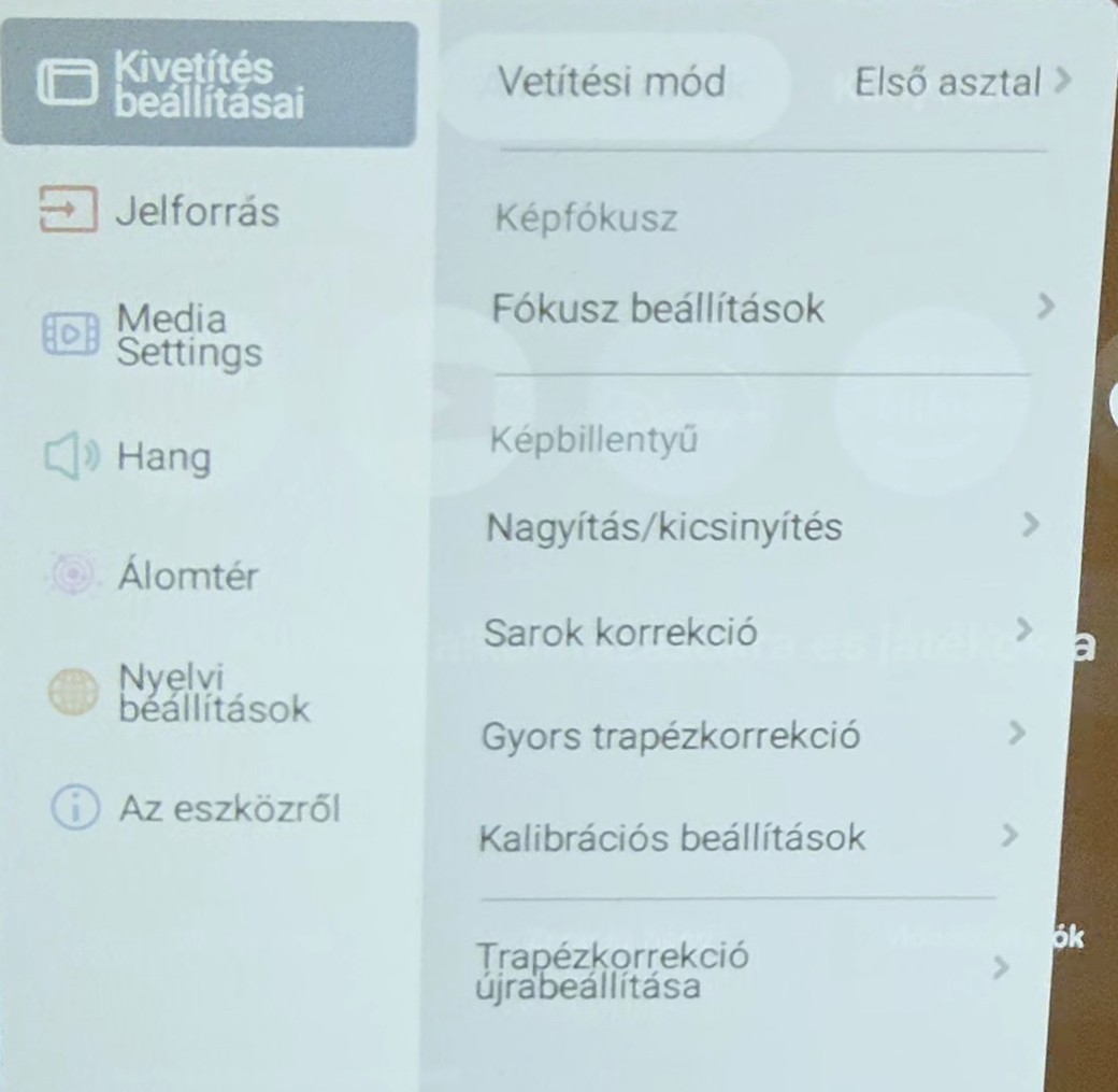 Beállíthatjuk a Kivetítés beállításait: itt található a vetítési mód, fókusz (autofókusz bekapcsolása, és ugyanez mozgatás közben), nagyítás / kicsinyítés, képkorrekciók, kalibráció,