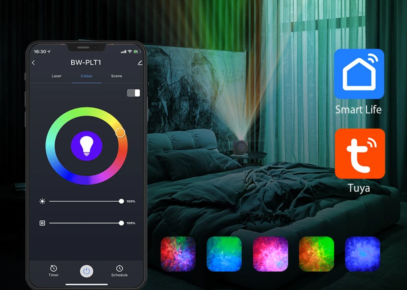 Telefonról vezérelhető appal, ami a gyakorlatban azt jelenti, hogy nem kell a projektorhoz nyúlni, mindent az alkalmazásból lehet állítani. Színek, fényerő, mozgás sebessége, időzítés, minden ott van egy helyen.