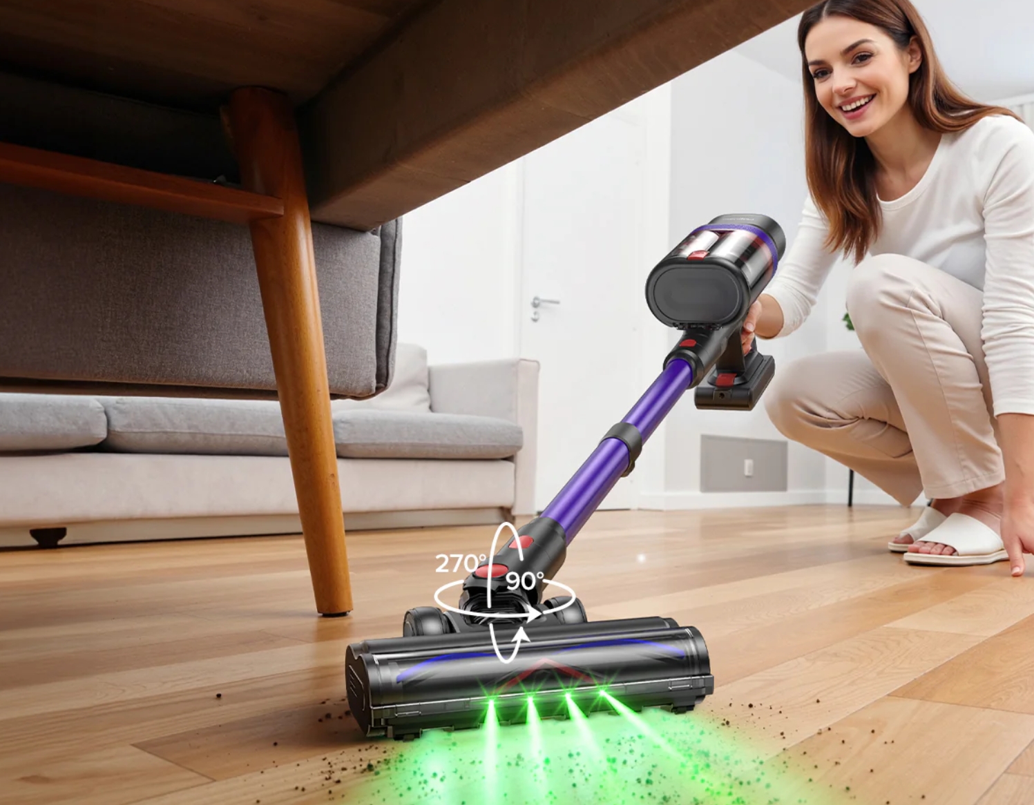 A zöld fény elsőre inkább tűnik látványelemnek, mint hasznos funkciónak, de valójában sokat segít. Sötétebb helyeken, például bútor alatt vagy sarokban jól látszik tőle a por és a szösz, amit szabad szemmel simán kihagynál. Ilyenkor jön rá az ember, hogy valójában mennyi kosz marad ott egy sima gyors áthúzás után.