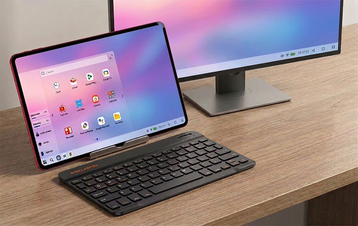 Viszont ennek a tabletnek a Type-C bemenetére egyik végén Type-C, másik végén HDMI kábellel (vagy elosztóval) ráköthetünk monitort, vagy TV-t is – de önmagában is használható egy billentyűzettel, mint extra könnyűsúlyú laptop.