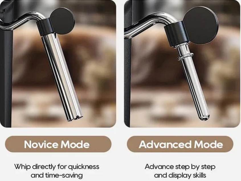 Oldalt ott a gőzkar, amivel simán elkészül a cappuccinohoz vagy lattéhoz szükséges tejhab. Van benne egyfajta “kezdő” és “haladóbb” használat is: először csak habot csinálsz, később már hőfokkal és szöggel is tudsz játszani.