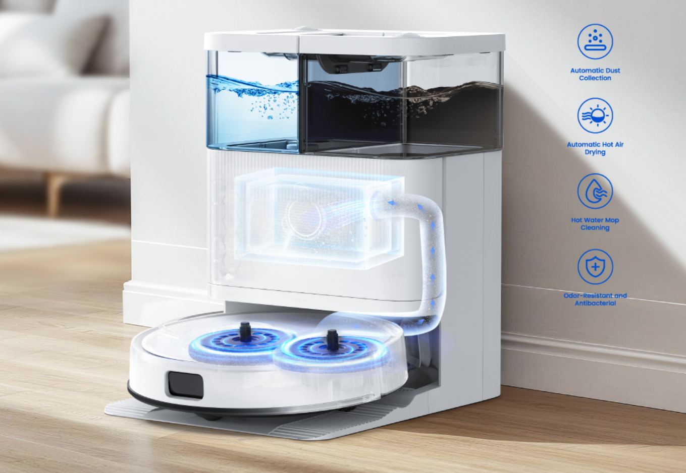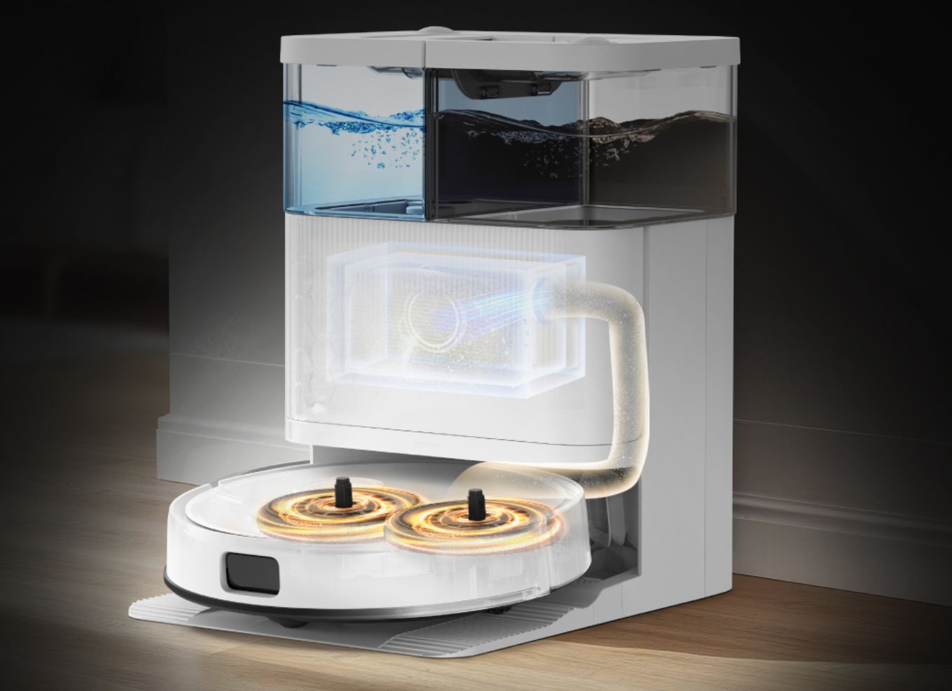 Vagyis porszívóként erős, de ez felmosó robot is, amihez van két forgó mop, amik hatékony tisztítást eredményeznek, ráadásul a vizet felmelegíti 50°C-ra, ami segít feloldani a makacsabb szennyeződéseket.