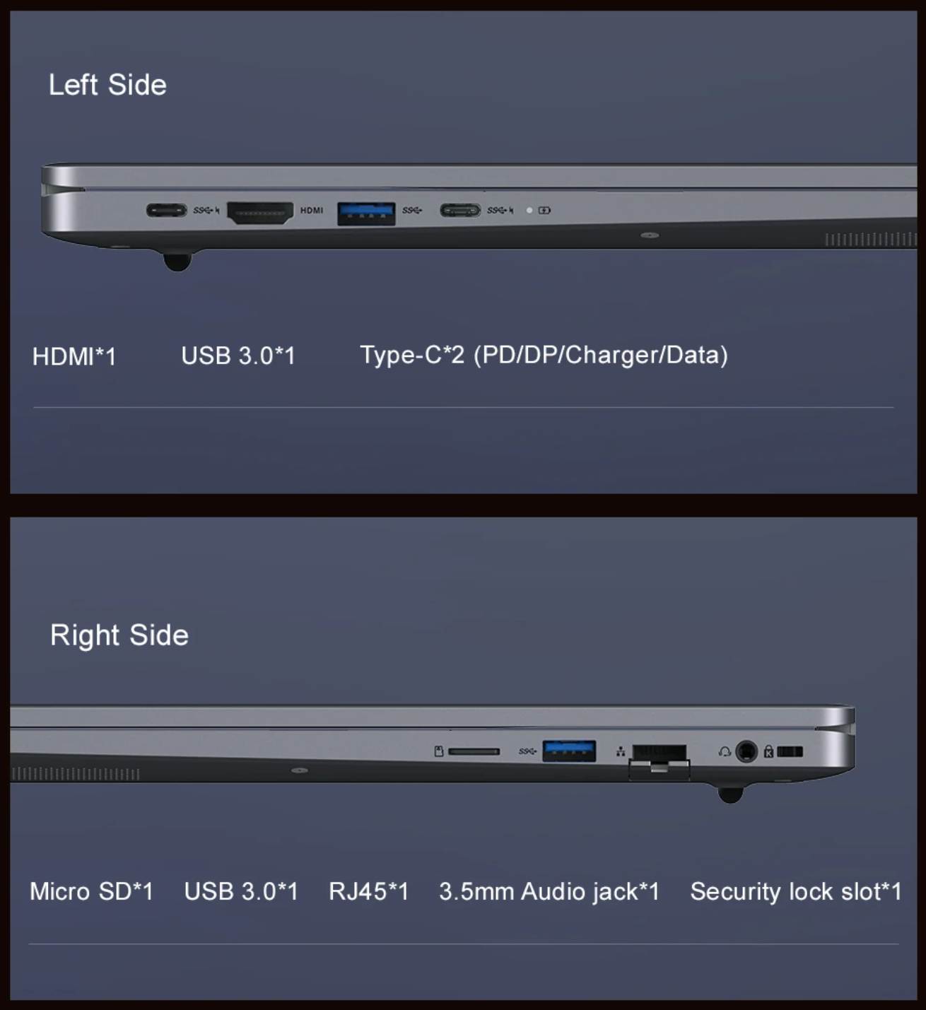 Bemenetekkel kiválóan felszerelt, mert van két teljes funkcionalitású Type-C (monitor, töltés is megy), két USB 3, 3.5mm jack, HDMI, memóriakártya és még LAN is.