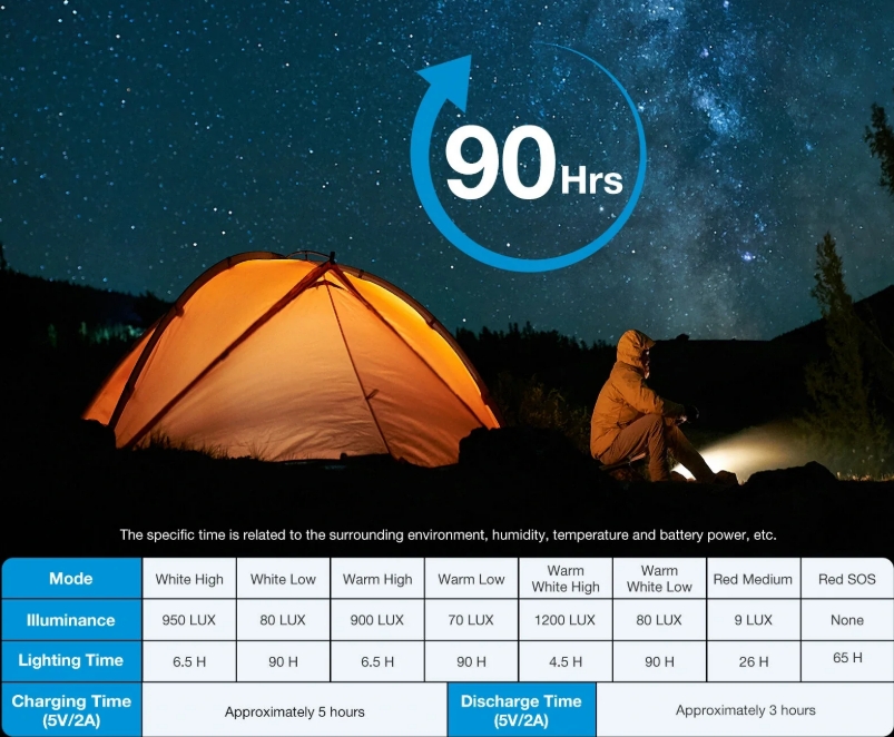 A beépített 9000mAh kapacitású akkumulátor gondoskodik a hosszú üzemidőről. Egyetlen feltöltéssel órákon át képes biztosítani a maximális fényerőt, de ha takarékosabb üzemmódba kapcsolsz, akár napokig is a társad lehet a sötétben.