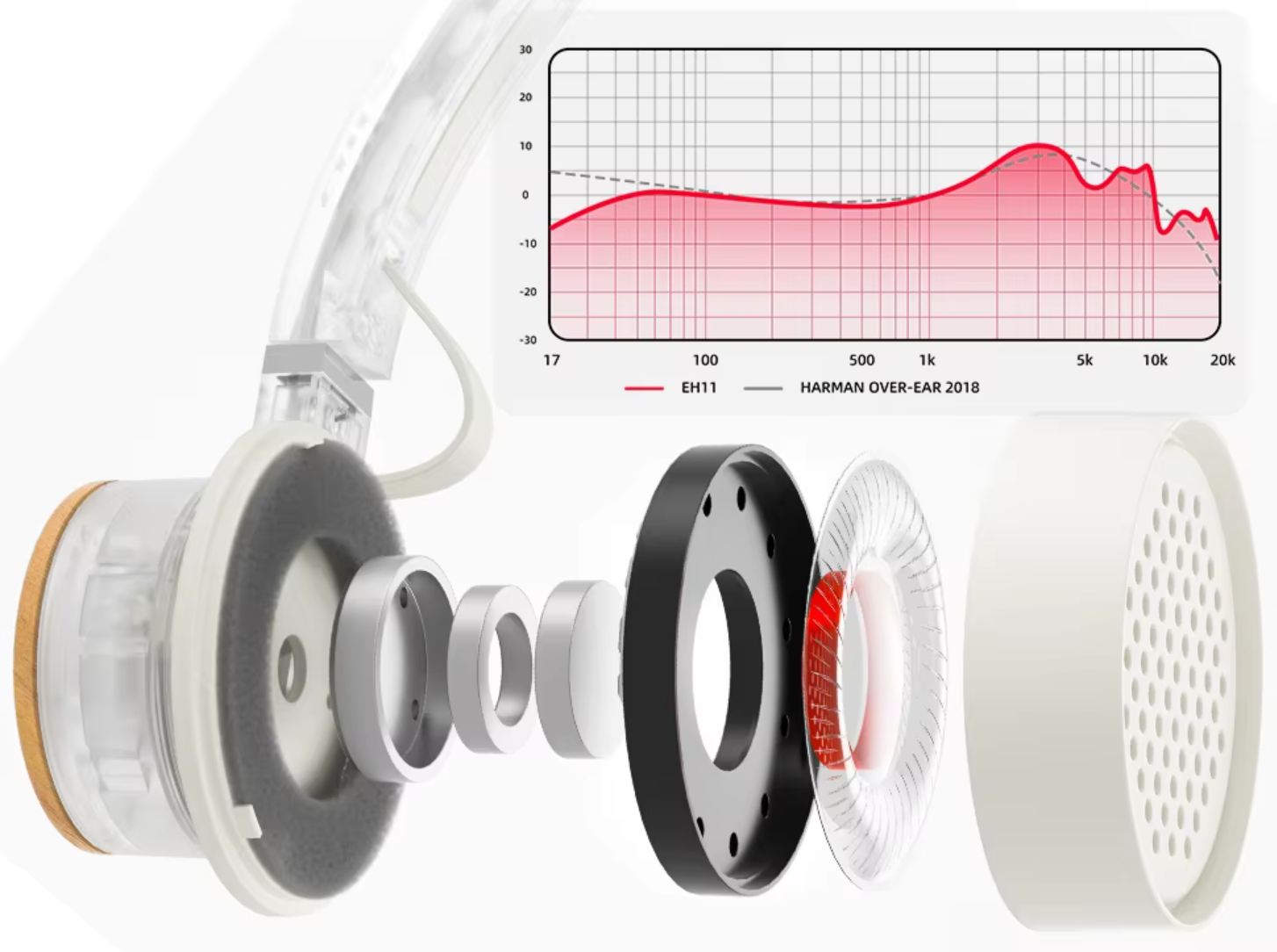 “Egy 40 mm-es, hosszú kitérésű meghajtót választottunk nagy csillapítású kompozit membránnal, hogy a rezonanciafrekvenciát 60 Hz-re csökkentsük. Ez lehetővé teszi, hogy az EH11 erőteljes, dinamikus basszust produkáljon egészen 17 Hz-ig, így lefedi az alacsony frekvenciájú hangszerek teljes spektrumát.
