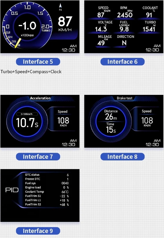 A Head-Up Display két üzemmódban is működik: OBD2 és GPS módban. OBD2 csatlakozással valós időben mutatja a sebességet, vízhőmérsékletet, akkumulátor feszültséget, fogyasztást, fordulatszámot, menetidőt, irányt, magasságot, turbónyomást, gyorsulási és fékezési teszteket, sőt, a hibakódokat is törölheted vele.
