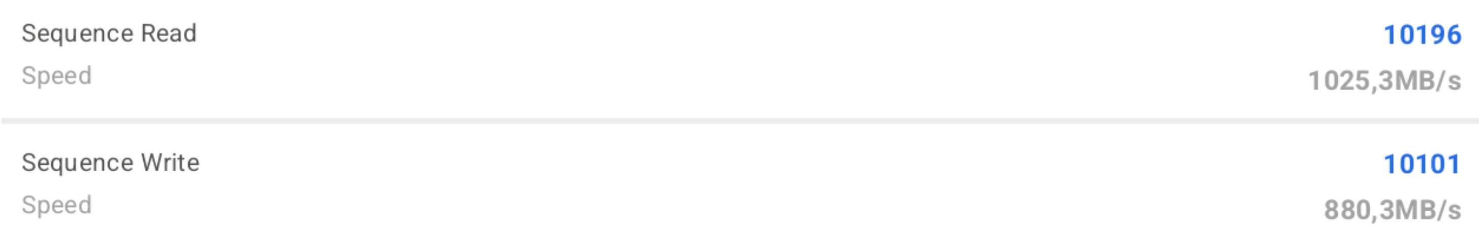 A tárhely sebessége egész jó, kb. 900 MByte / mp írási, 1000 MByte / mp olvasási sebességgel.
