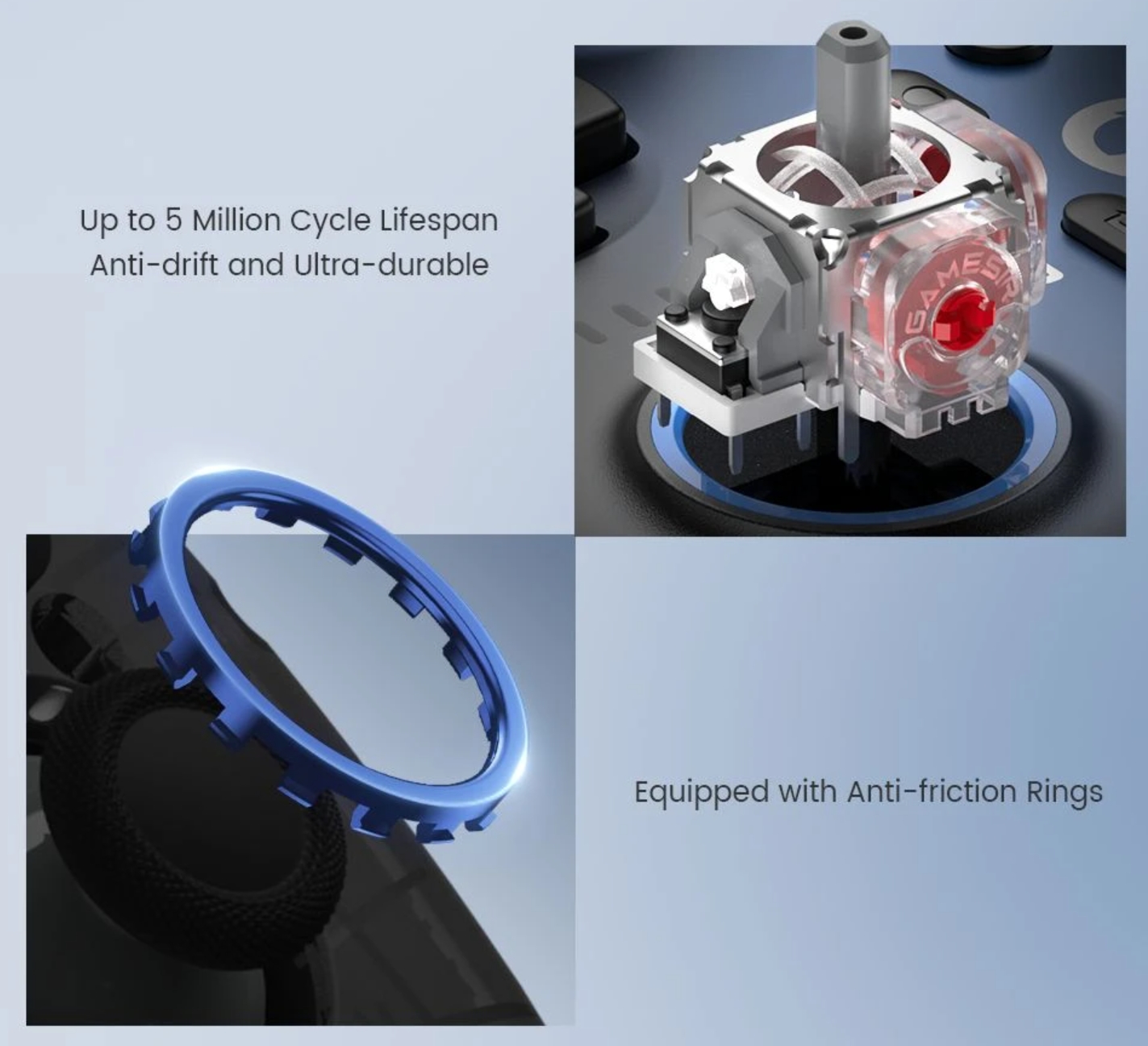 A vezérlő egyik kiemelkedő jellemzője a GameSir Hall Effect érzékelős joystickok alkalmazása. Ezek az érzékelők akár 5 millió ciklusos élettartamot biztosítanak, miközben pontos és gyors visszacsatolást nyújtanak. A súrlódásgátló siklógyűrűk tovább növelik a joystickok sima mozgását és csökkentik a kopást, ezáltal meghosszabbítva a használati időt.