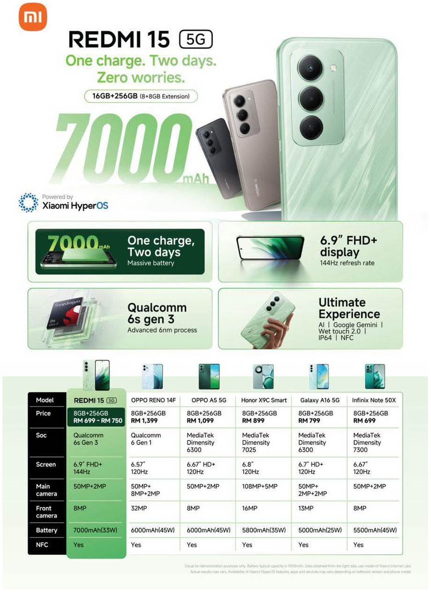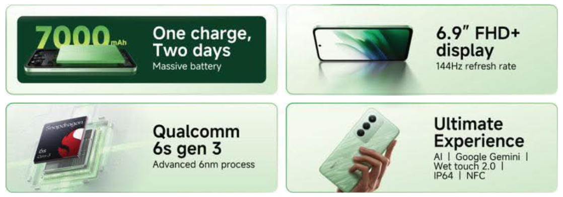 A telefon az „Egy töltés. Két nap. Nulla gond” szlogennel jelenik meg, és ezt egy hatalmas, 7000 mAh-s akkumulátorral igazolja. Jelenleg csak két Xiaomi telefon rendelkezik nagyobb kapacitással, a REDMI Turbo 4 Pro és a REDMI K80 Ultra, amelyek mindkettő csúcskategóriás modell.