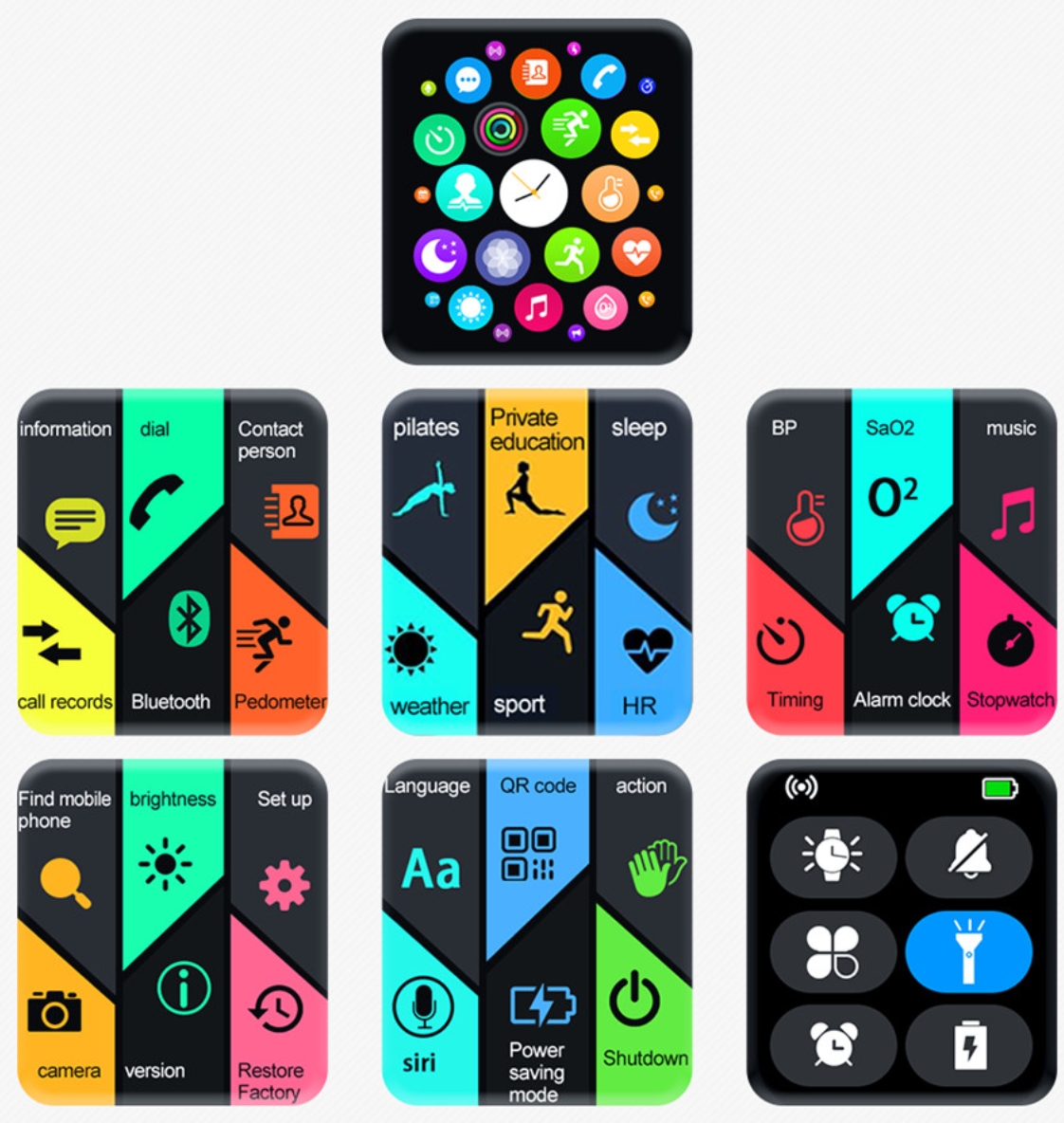 Ébresztőóra, idő, dátum kijelzés, kamera távvezérlés, időjárás, bluetooth hívás, bluetooth zenelejátszás, telefonkönyv, hívás indítása, naptár, számológép, stopper, stb.