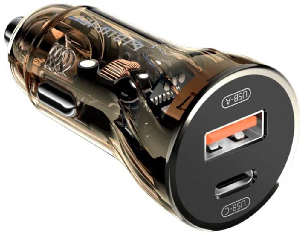 Átlátszó házzal rendelkező szivargyújtóba bedugható töltő.
