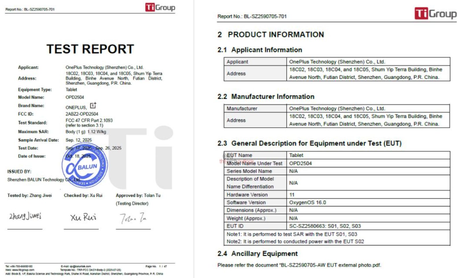 Az OPD2504 modellkód alatt szereplő bejegyzést az FCC ID azonosítót is tartalmazza: 2ABZ2 OPD2504. A dokumentum szerint a rendszer OxygenOS 16 Android 16 alapokon, a hardververzió pedig 11.