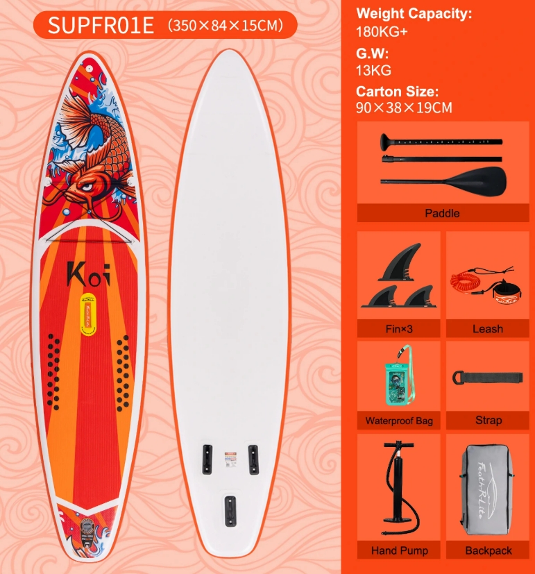 A FunWater SUP teljes felszereltséggel érkezik, így azonnal vízre szállhatsz vele. A csomag tartalmaz egy állítható alumínium evezőt, nagy teljesítményű kézi pumpát nyomásmérővel, három levehető uszonyt, biztonsági bokapántot, vízhatlan telefontokot, valamint egy tágas, könnyen pakolható hátizsákot.