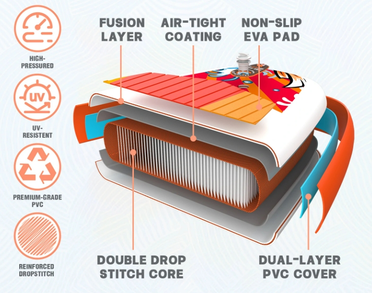 A nagy felületű, csúszásgátló borítás biztosítja, hogy stabilan állhass rajta, akár hullámosabb vízen is. A fedélzeten található rugalmas pántok alatt kényelmesen elhelyezheted a vízparti felszerelésed vagy egy vízhatlan táskát.