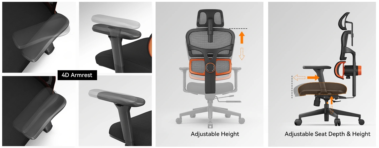 Az ülőlap mélysége 5 cm-es úton állítható, hogy combközépen támaszkodjon és ne vágja a térdhajlatot, a szinkronmechanika 96°/106°/116°/136° pozíciókban reteszel, állítható ellenállással. A fejtámasz 13 cm-en mozgatható és 30°-ban dönthető, a karfák 3D-ben állnak (fel–le, előre–hátra, kifordítás), párnázott felülettel.