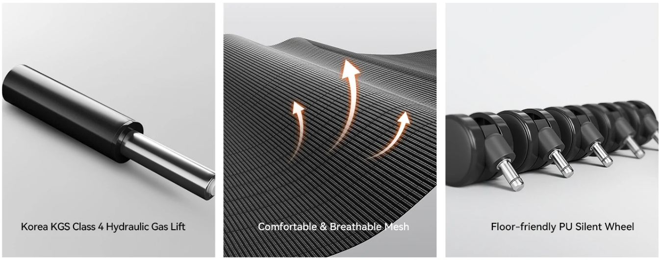 A hálós háttámla jól szellőzik, a rugalmassága miatt nem „deszka”, mégis tart és a párnázott ülőlap visszarugózó szivaccsal dolgozik, hogy ne üljön ki pillanatok alatt.