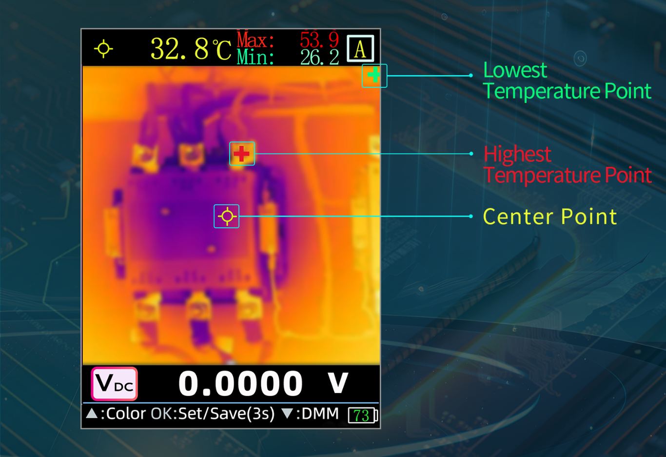Ez különösen hasznos lehet túlmelegedő csatlakozások, terhelt vezetékek vagy rejtett hibák gyors azonosításánál. A hőkép valós időben jelenik meg a kijelzőn, így a problémás pontok azonnal láthatóvá válnak.