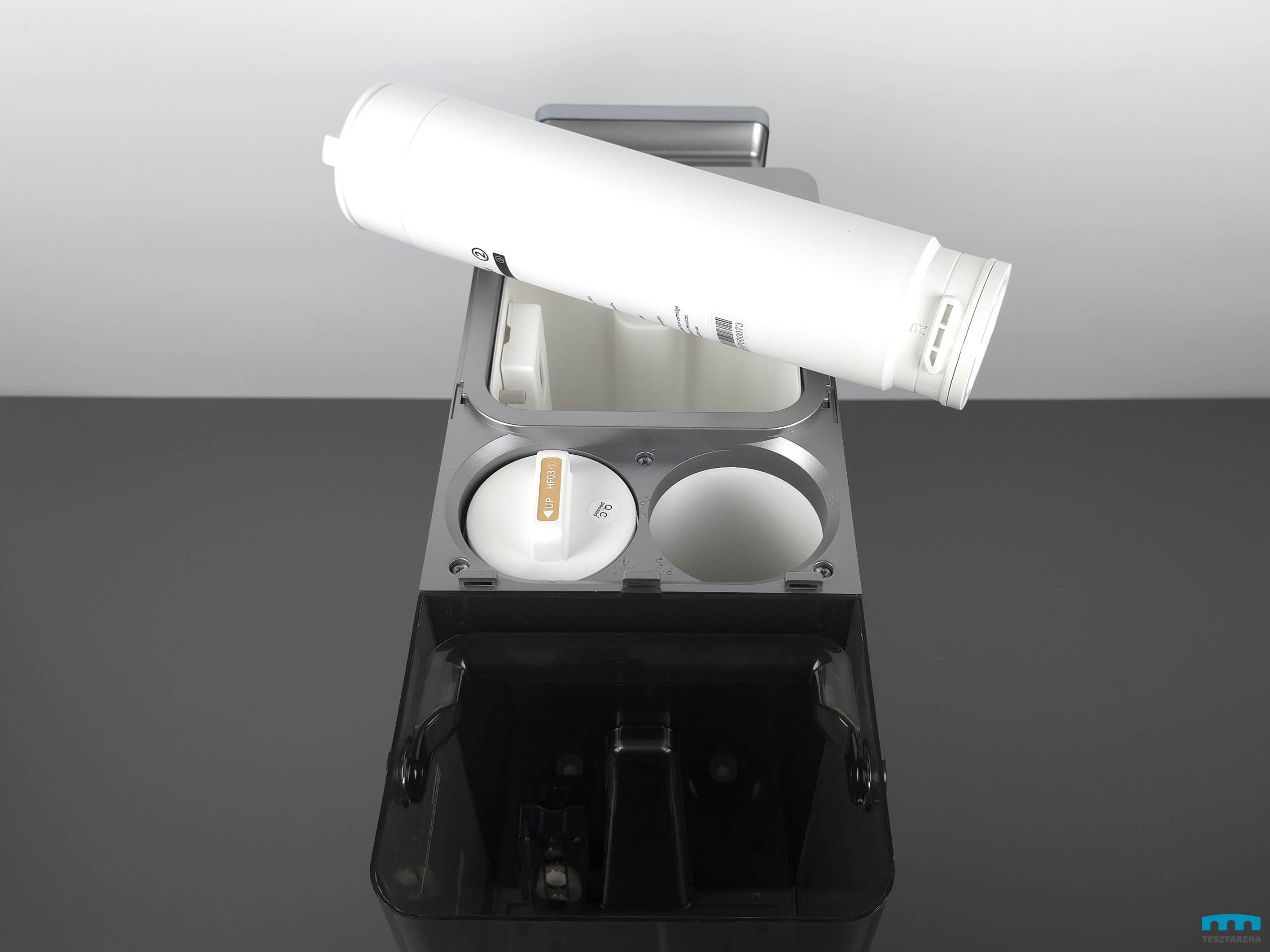 A teteje könnyen levehető és ott van a két szűrő, valamint a belső, 2 literes tisztavíz tartályban, ahol összegyűlik a megtisztított víz. A tartály alján egy UV lámpa még utólag kezeli a vizet, így baktérium mentesen tartva.