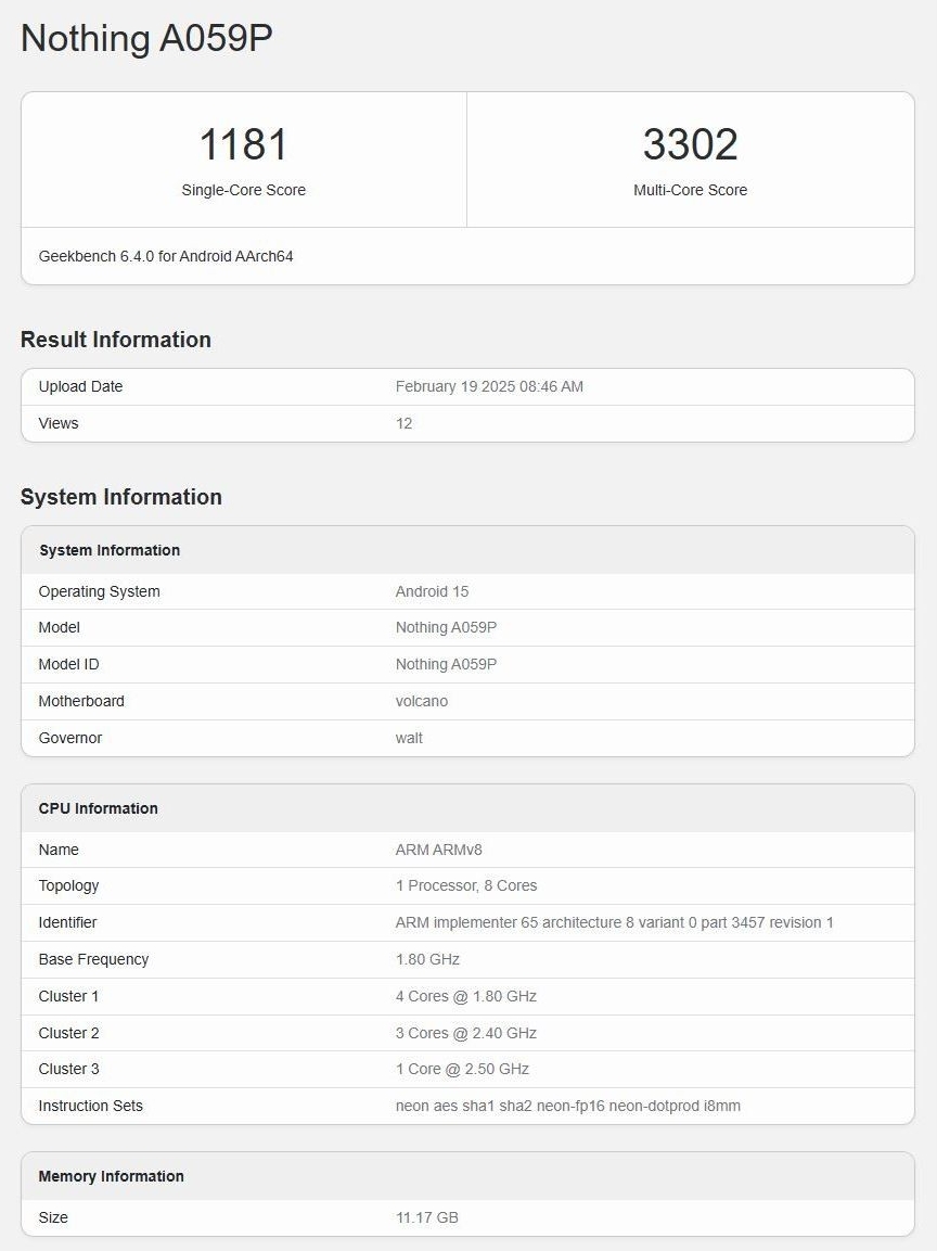 A Nothing Phone 3a Pro prototípusa a Geekbench 6.4.0 Androidos verziójában 1181 pontos egymagos és 3302 pontos többmagos eredményt ért el.
