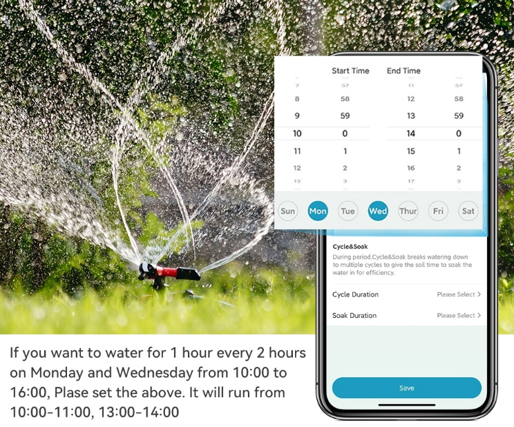 Az időjárásfigyelés és az esőszünet funkciók gondoskodnak arról, hogy csak akkor induljon el az öntözés, amikor valóban szükség van rá, elkerülve a felesleges vízhasználatot.