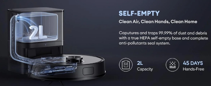 Az önürítő funkció az egyik legkényelmesebb tulajdonsága ennek a modellnek. Amikor a robotporszívó visszatér a dokkolóállomáshoz, a rendszer automatikusan kiszippantja a port a készülék tartályából. A dokkoló 2 literes porzsákja átlagos használat mellett 45~ napig képes tárolni az összegyűjtött szennyeződéseket, így 1.5 hónapig nincs rá gond.