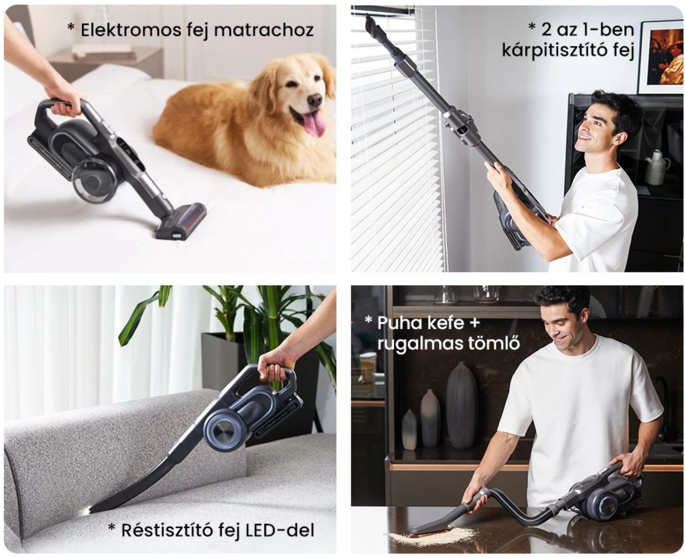 Kemény felületről legkisebb szívóerővel is minden tipikus szennyeződést felszed, mint a por, morzsa, szőr, apró murva és még ott a turbo, max fokozat, amivel szőnyegekből is eltüntet mindent.
