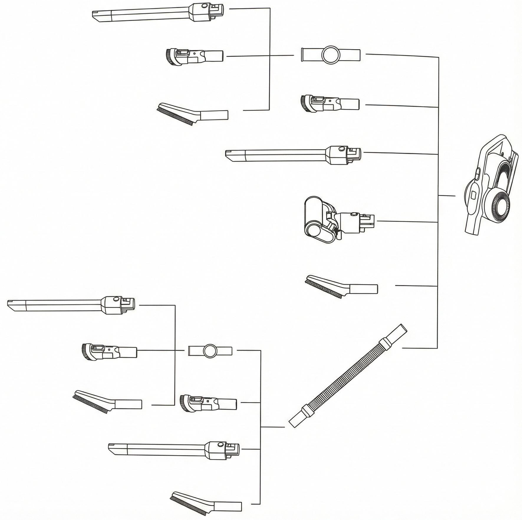 Mindenféle kombinációban használható, mert a gép használható csövek nélkül valamelyik porszívófejjel, csövek nélkül, de azzal a tetszőleges szögbe beállítható toldalékkal, valamelyik csővel és valamelyik porszívófejjel, plusz csővel, a toldóval és még egy porszívófejjel. 😀