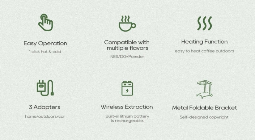 - Tartozékok: tárolótáska, összecsukható tartó, AC adapter, USB kábel, autós töltő, kapszula- és kávéadapterek, mérőkanál