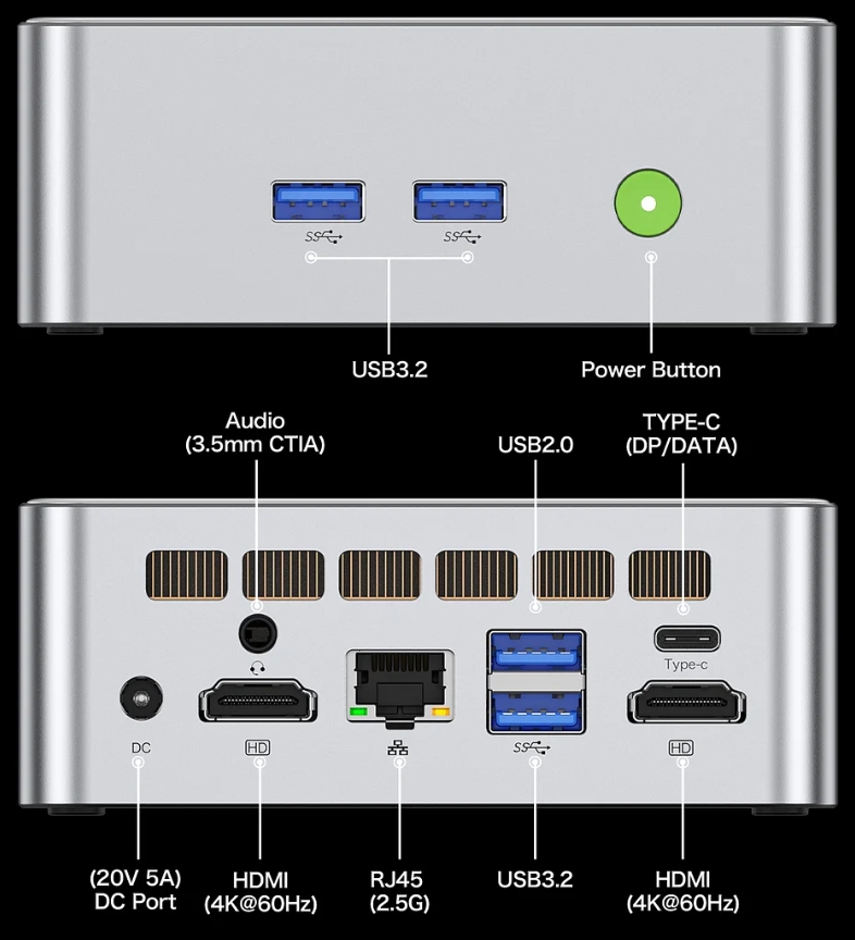 Ez egy szebb mini PC, amelynek szürkék az oldalai és fényes fekete a teteje.