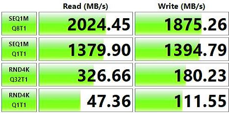 Az SSD meghajtó sebessége elég jó, amely maximum kb. 2000 MByte / mp szekvenciális olvasási és 1900 MByte / mp írási sebességet jelent.