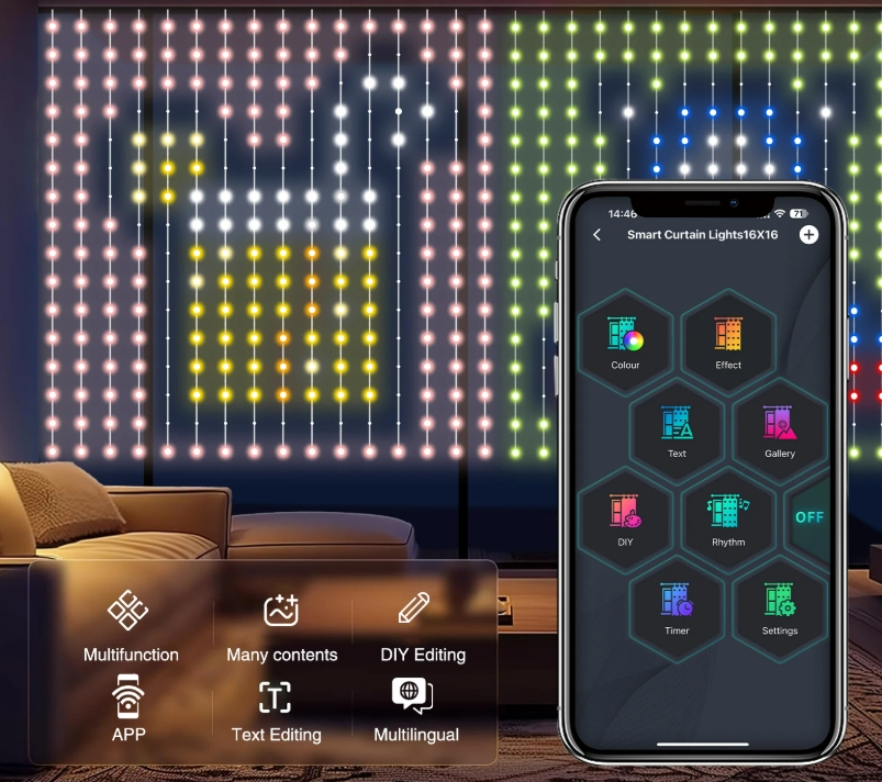 A végeredmény: egy olyan fényfüggöny, amelyen akár mozgó minták, színátmenetek, hullámzó effektek vagy egyedi fényjátékok is megjeleníthetők – mindezt egyszerűen, okostelefonról vagy távirányítóval.