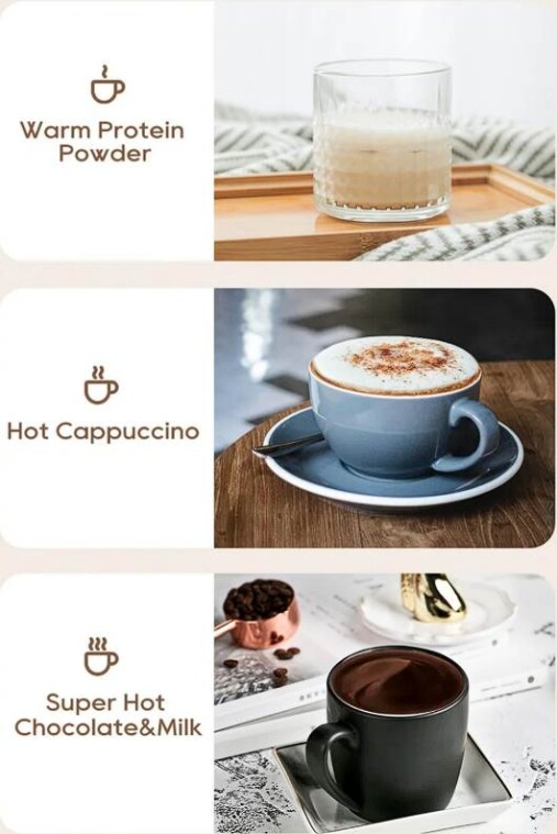 Van olyan alkalom, amikor egyszerűen csak langyos, vagy forró tejre van szükséged hab nélkül. Ilyenkor akár 300 ml tejet is felmelegíthetsz benne, legyen szó forró csokiról, kakaóról, vagy fehérjés turmixról. A gép ereje elég ahhoz is, hogy fehérjeitalokat vagy forró csokis krémeket készíts, szép sima állaggal.