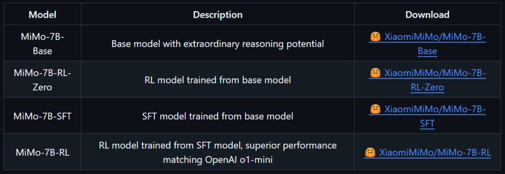 Ez a technológiai óriás első nyílt forráskódú következtetési modellje, amely olyan kínai modellekkel versenyez, mint a DeepSeek R1 és az Alibaba Qwen QwQ-32B, illetve globális szereplőkkel, például az OpenAI o1 és a Google Gemini 2.0 Flash Thinking modellekkel. A MiMo család négy különböző modellt tartalmaz, amelyek mindegyike egyedi felhasználási esetre készült.
