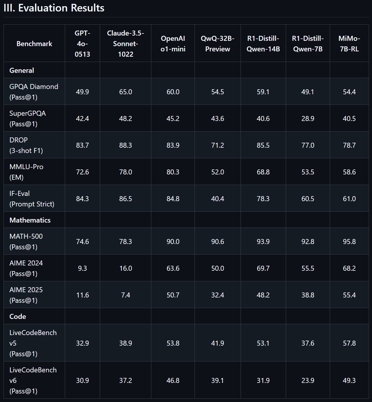 A belső tesztek alapján a Xiaomi kutatói azt állítják, hogy a MiMo-7B-Base modell 75.2 pontot ért el a BIG-Bench Hard (BBH) benchmark tesztjén a következtetési képességek terén. A zero-shot megerősítéses tanuláson (RL) alapuló MiMo-7B-RL-Zero modell kimagaslóan teljesít matematikai és programozással kapcsolatos feladatokban, és 55.4 pontot ért el az AIME benchmarkon, 4.7 ponttal megelőzve az o1-mini modellt.