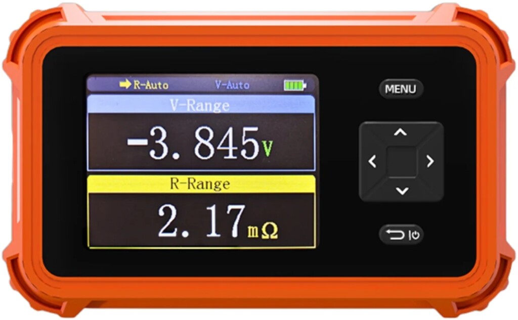 Belső ellenállás mérése: 0,1–200 mΩ tartományban, 0,1 mΩ felbontással és ±0,5 mΩ pontossággal.