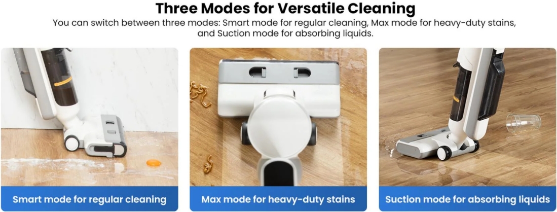 - Tisztítási módok: Normál, Max, Szívás (csak porszívózás)