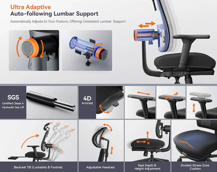 Ami azonnal szemet szúr, az a különleges deréktámasz mechanika. Ez nem egy fix ponton nyomja a hátadat, hanem automatikusan leköveti a mozgásodat, így folyamatosan támasztja a gerincoszlopot.