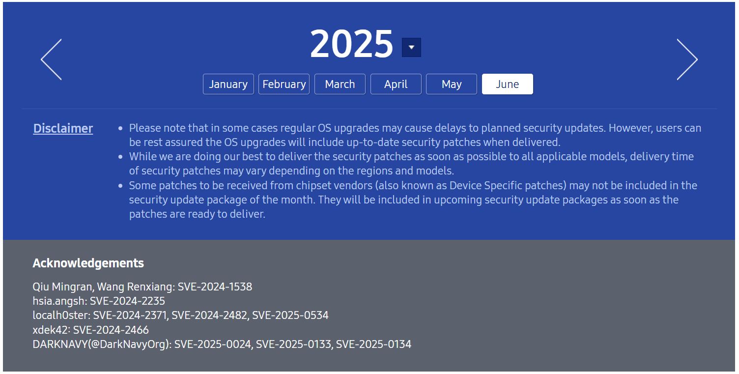 A Samsung nem kevesebb, mint 19, a saját szoftverében felfedezett sebezhetőséget javított ki. A Samsung saját javításain túl a 2025. júniusi frissítés számos, az Android operációs rendszer magjában található sebezhetőségre is megoldást kínál.