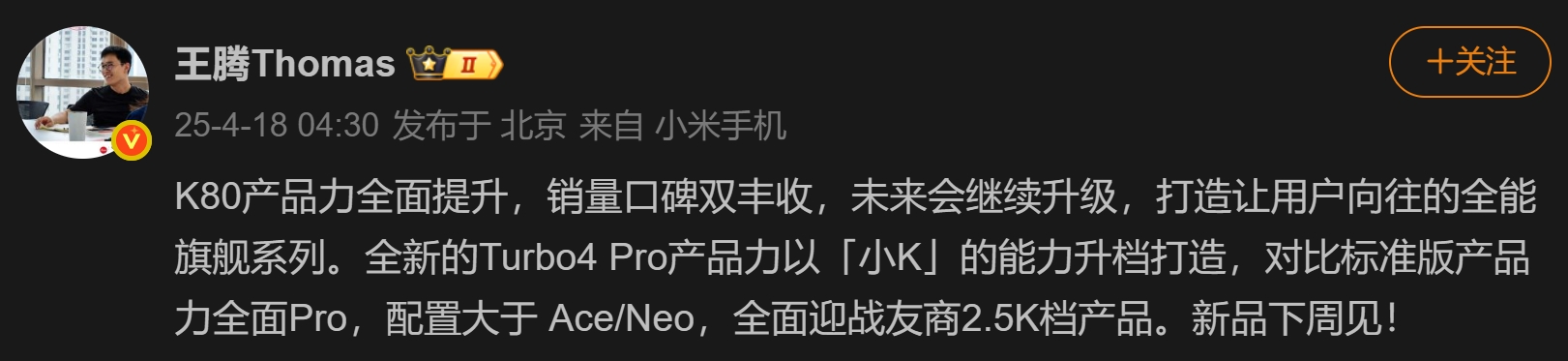 “A K80 termékcsalád teljes mértékben frissült: az eladások és a márkaismertség is jelentős növekedést mutat, a jövőben további fejlesztések várhatók, melyek célja egy minden igényt kielégítő csúcskategóriás sorozat megalkotása. Az új Turbo4 Pro termék a „K” sorozat képességeinek továbbfejlesztésével készült, a standard verzióhoz képest erősebb Pro teljesítményt kínál, nagyobb specifikációkkal, mint az Ace/Neo modellek. Teljes mértékben készen áll arra, hogy versenybe szálljon a 2.5K kategóriás termékek piacán. Az új modellek jövő héten érkeznek!”